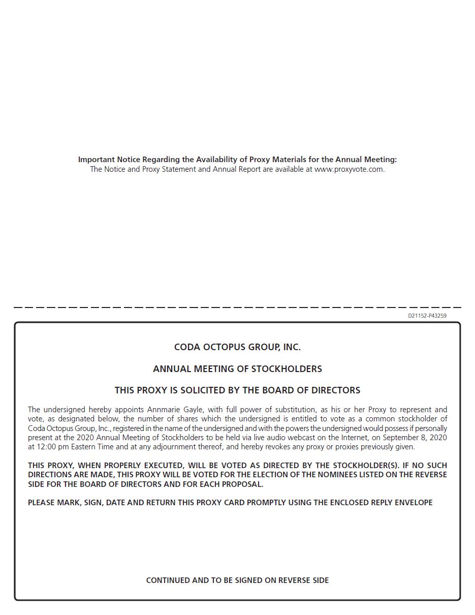 You are cordially invited to attend the 2020 Annual Meeting of Stockholders of Coda Octopus Group, Inc. (the “Company”) to be held at 12:00 p.m., E.D.T., on September 8, 2020. As a result of the public health and travel risks and concerns due to the COVID-19 pandemic, this year’s annual meeting will be held via live audio webcast on the internet. You will be able to participate, vote and submit your questions during the annual meeting by visiting www.virtualshareholdermeeting.com/CODA2020. You will not be able to attend the annual meeting physically. At the annual meeting, we will ask our stockholders:
