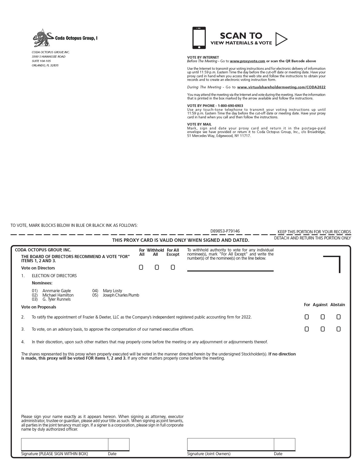 | ● | Mail: If you received printed copies of the proxy materials, please complete, sign, date and return your proxy card by mail so that it is received by Coda Octopus Group, Inc., c/o Broadridge Financial Solutions, Inc., prior to the Annual Meeting. | |