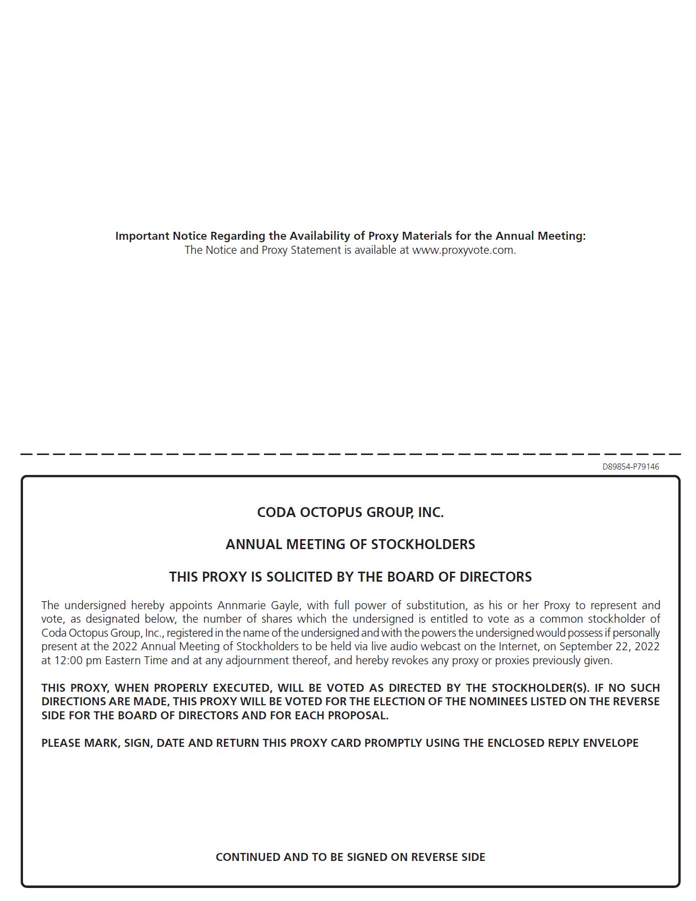 You are cordially invited to attend the 2022 Annual Meeting of Stockholders of Coda Octopus Group, Inc. (the “Company”) to be held at 12:00 p.m., Eastern Time, on September 22, 2022. This year’s annual meeting will be held via live audio webcast on the internet. You will be able to participate virtually, vote and submit your questions during the annual meeting by visiting www.virtualshareholdermeeting.com/CODA2022. You will not be able to attend the annual meeting physically. At the annual meeting, we will ask our stockholders: